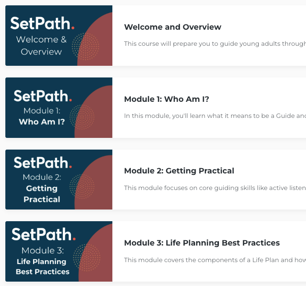 SetPath equips Guides to help young adults build a Life Plan rooted in values, vision, and intentional growth. Our training prepares mentors to ask thoughtful questions, provide accountability, and support Planners as they reflect on key areas of life like relationships, work, money, health, spirituality, and purpose. Because no two Life Plans look the same, Guides are trained to support each Planner with flexibility, wisdom, and encouragement.
